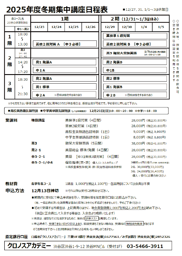 ・ 2025年度 冬期講習日程表(PDF)